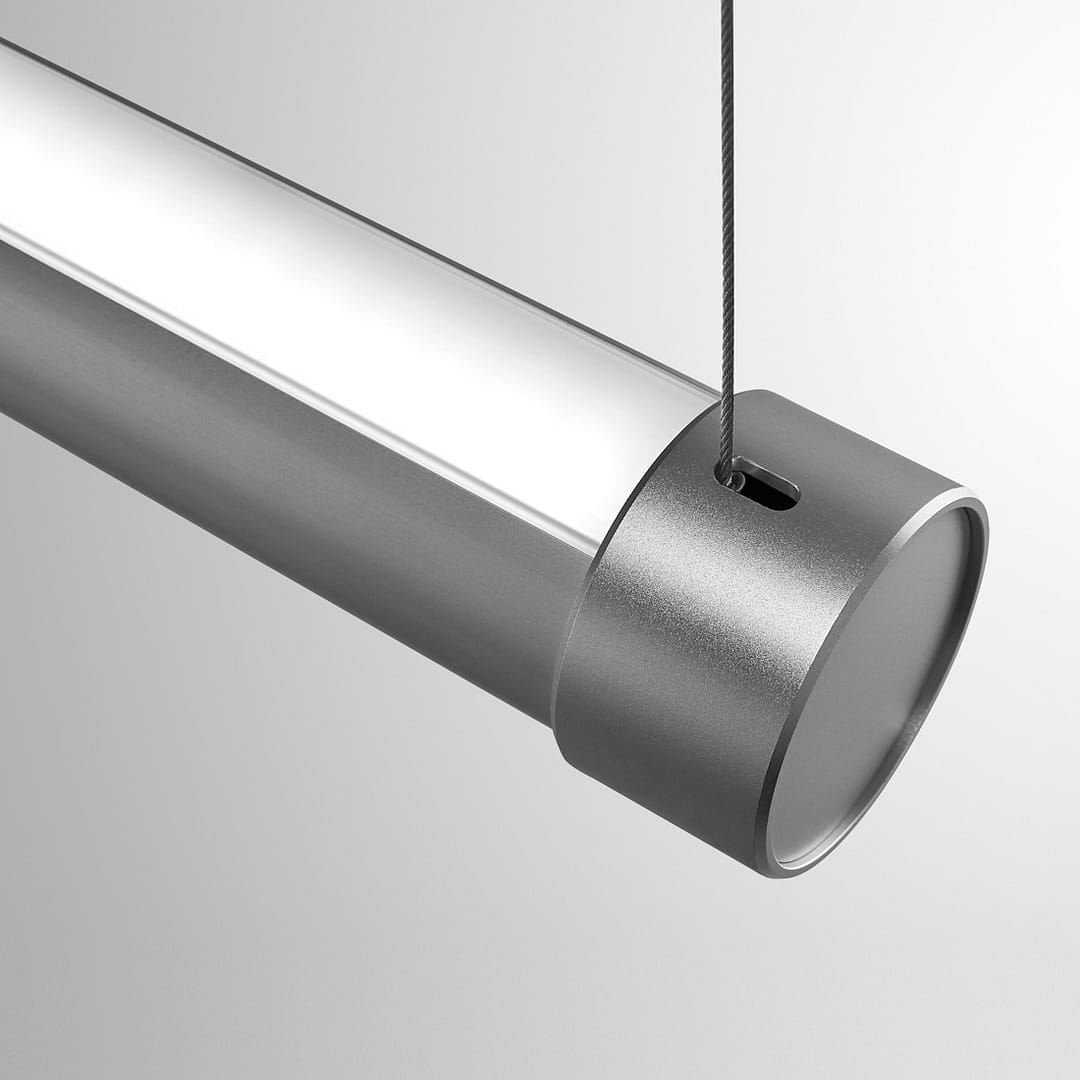 Not only is the L2 luminaire itself stunning, but its light is equally captivating. The specially developed diffusers create a soft, homogeneous light line that evenly illuminates the workspace. At the top, a few LED boards with plastic shielding provide indirect lighting via the ceiling, ensuring a beautifully uniform light distribution. The luminaire is crafted from clear anodized aluminum, and its 53mm diameter offers a subtle yet impactful presence in any space.